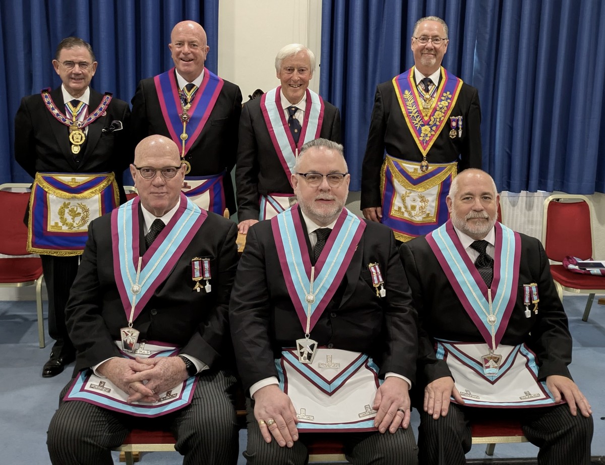 The P.G.M. and a delegation received a warm welcome. There were three joining members from the USA in the Mark meeting and in the Royal Ark Mariners along with the proclamation of W Bro David William Blythe as Commander. There was also a demonstration of the Elevation ceremony with the new members as the candidates. After the meeting the Brethren enjoyed a convivial Festive Board. Photos by Gary Harding and Gary Stratmann