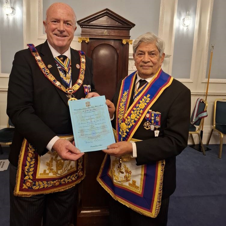 On Saturday 15th November R.W.Bro. Tom Quinn PGM and a Delegation visited London East Africa RAM and Mark Lodges. The PGM Installed W Bro Shirish K Patel as Commander of the RAM. In the Mark he witnessed a rehearsal of an Advancement before presenting W Bro Shirish Patel Senior with a 40 year Mark certificate.