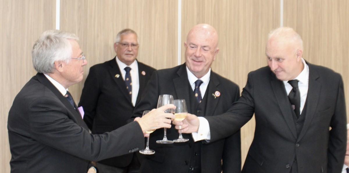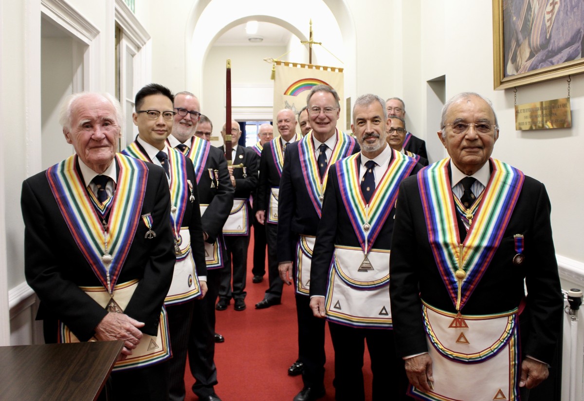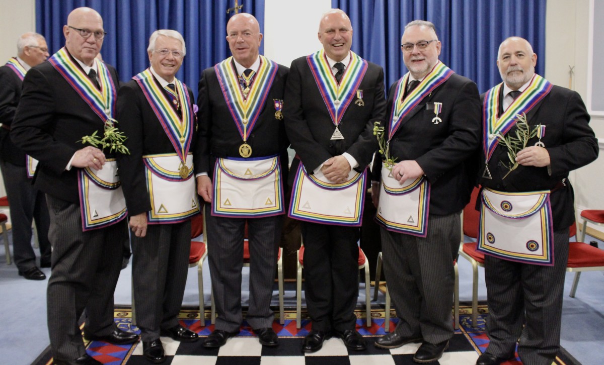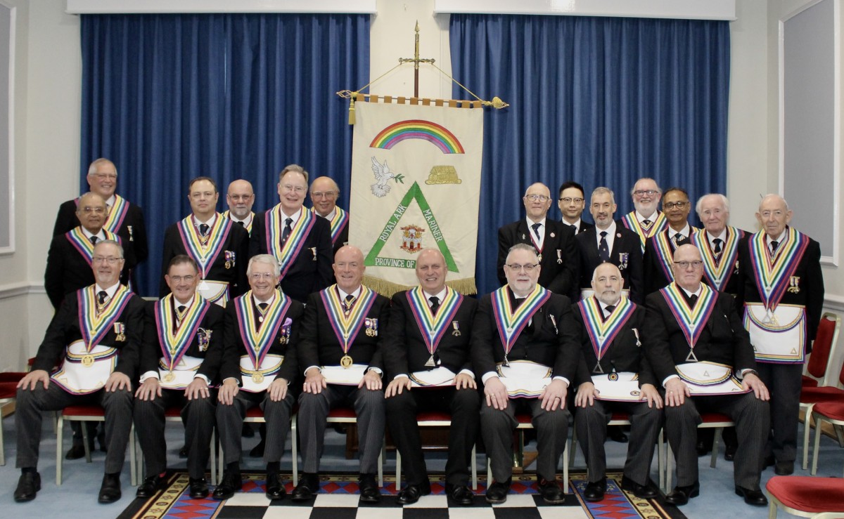 The P.G.M. and a delegation received a warm welcome. There were three joining members from the USA in the Mark meeting and in the Royal Ark Mariners along with the proclamation of W Bro David William Blythe as Commander. There was also a demonstration of the Elevation ceremony with the new members as the candidates. After the meeting the Brethren enjoyed a convivial Festive Board. Photos by Gary Harding and Gary Stratmann